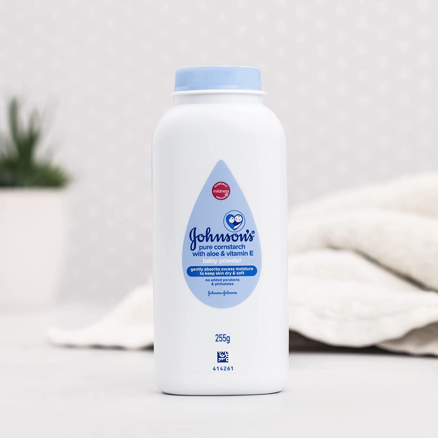 Johnsons Baby Powder with Naturally Derived Cornstarch Aloe Vera and Vitamin E, Hypoallergenic, 9 oz.