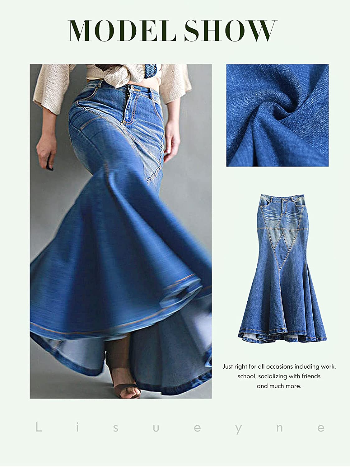 LISUEYNE Women's Casual Stretch Waist Washed Denim Ruffled Fishtail Skirt Long Denim Skirt $151.0 |