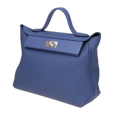 HERMES/HERMÈS Ladies Blue Cowhide Metallic Silver Buckle Handbag Tote Handbag Clutch Women's Bag 242435CMAATG - Teem