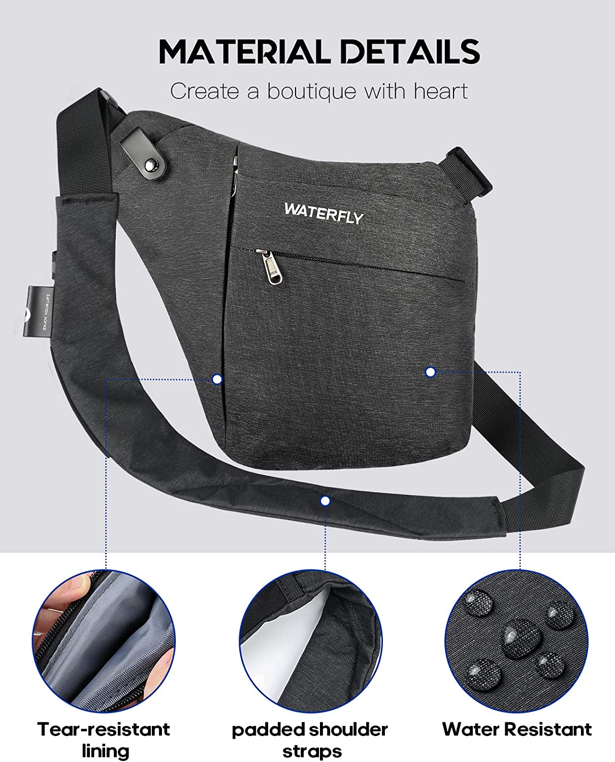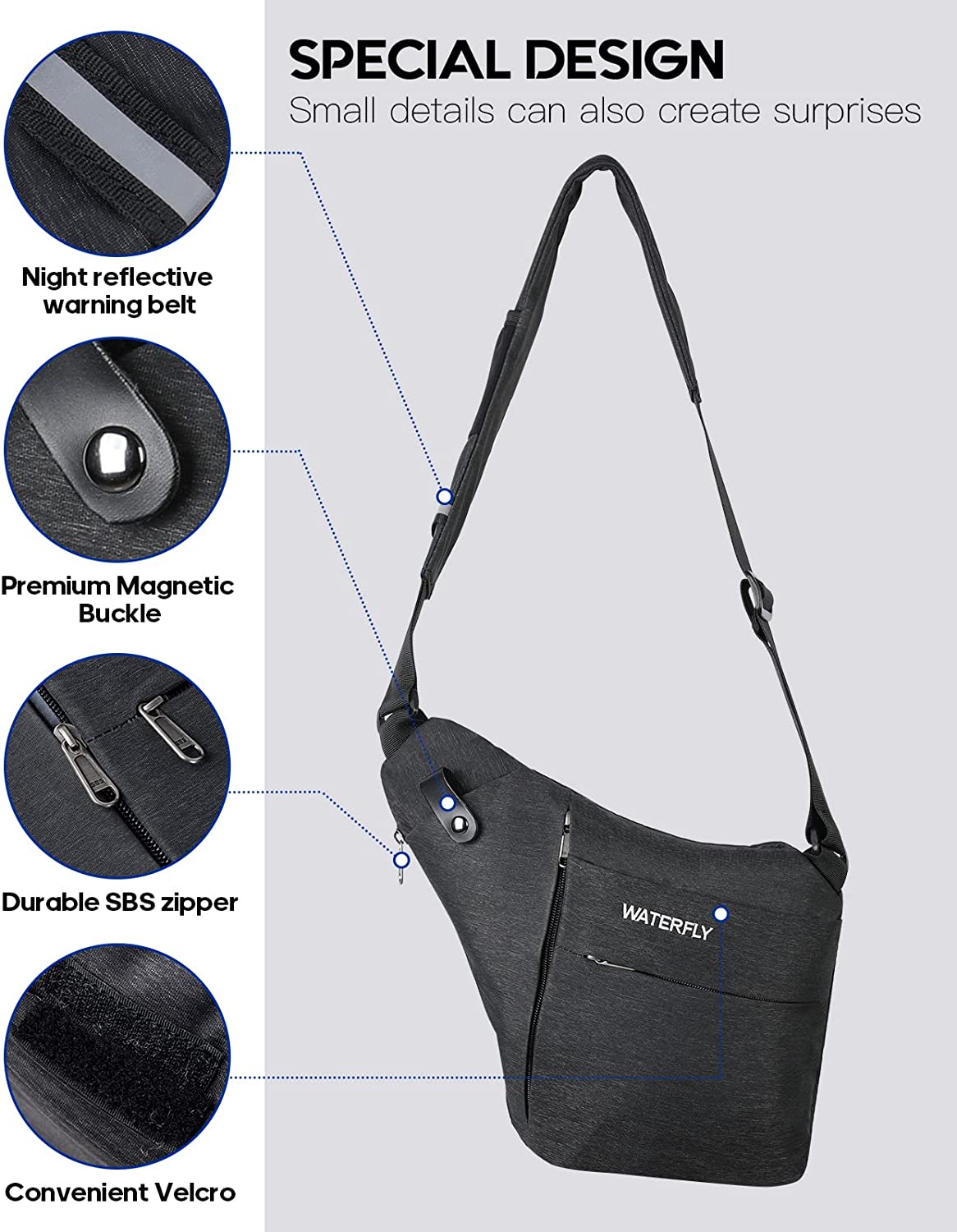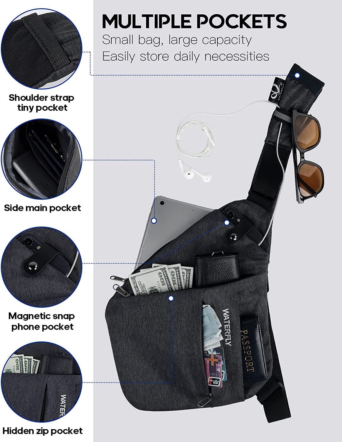 WATERFLY Sling Crossbody Chest Bag: Slim Anti Theft Crossbody Shoulder Bag Invisible Side Bags Men Women