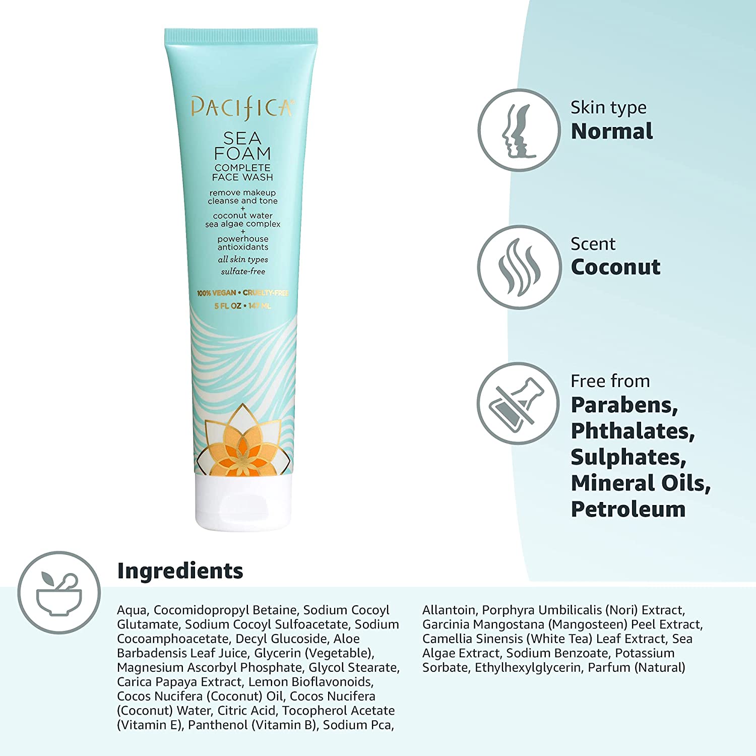 Pacifica Beauty Sea Foaming Cleanser, Daily Gentle Foaming Cleanser with Coconut Water + Seaweed Complex, Removes Makeup, Suitable for Combination and Oily Skin, Vegan and Cruelty-Free, Cleansing Skin Care