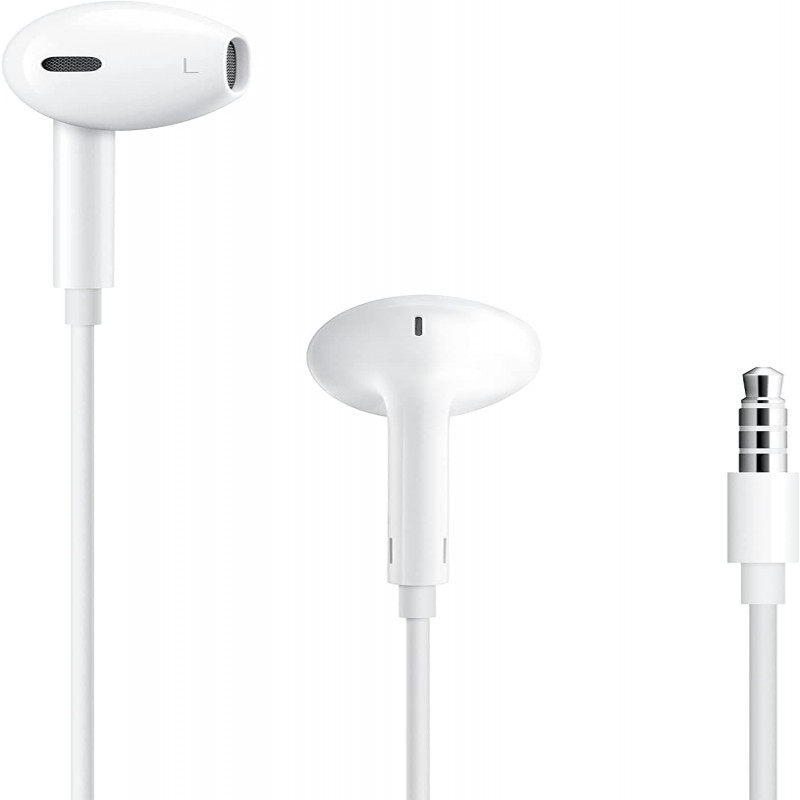 Apple EarPods headphones with 3.5mm plug. Microphone with built-in remote controls music, phone calls, and volume. Corded earbuds
